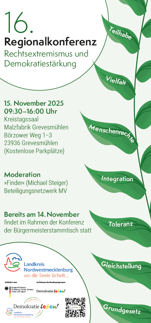 Die Regionalkonferenz Rechtsextremismus & Demokratiestärkung macht am 15.11.2025 zum zweiten Mal in ihrer Geschichte Station in Grevesmühlen. Sie folgt einer Einladung der Partnerschaft für Demokratie des Kreises Nordwestmecklenburg.